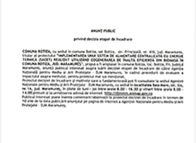 Poienar Florea – reprezentant al Comunei Botiza, in calitate de primar, cu sediul in comuna Botiza, sat Botiza, nr. 416, judetul Maramures, anunta publicul interesat asupra depunerii solicitarii de emitere a acordului de mediu pentru proiectul: ,,Sprijinirea investitiilor in noi capacitati a energiei electrice produsa din surse regenerabile pentru autoconsumul Comunei Botiza”, propus a fi amplasat in comuna Botiza, fara