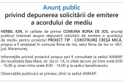 COMUNA RONA DE JOS, titular al proiectului PROIECT TIP - CONSTRUIRE CRESA MICA, propus a fi amplasat in comuna Rona de Jos, satul Rona de Jos nr. 667, jud. Maramures, anunta publicul interesat asupra luarii deciziei etapei de incadrare de catre ANMAP, in cadrul „procedurii de evaluare a impactului asupra mediului, pentru proiectul mai sus mentionat.