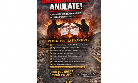 Iată ce au refuzat cei din coaliție să finanțeze: Serviciul de mari arși, respectiv digitalizarea la Spitalul Județean Baia Mare; modernizarea străzilor din Sighetu Marmației; infrastructură în Borșa (proiect de 42.000.000 lei); reabilitarea rețelei de apă potabilă din Săpânța; zonă borcut și turism din Botiza; canalizarea din Petrova; cămin cultural și teren de sport în Finteușu Mare; casă parohială în Rodina