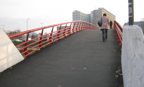 Convexitatea e prea accentuată. Puntea asta pietonală comportă o diferenţă de atmosferă, de la bază la vârf, capabilă să-ţi dea ameţeli. Nu mă pricep la artă, da’ cred că era mai indicat stilul baroc. Proiectantul se putea juca de-a liniile curbe sub suprafaţa de traversare, lăsând orizontala la dispoziţia trecătorilor.