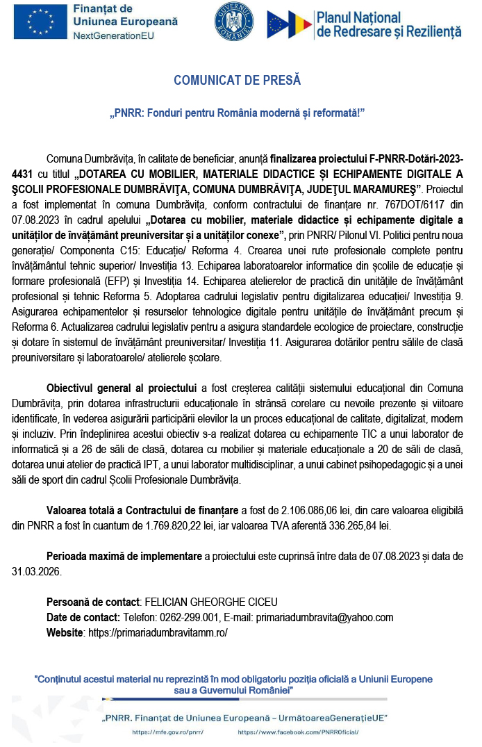 COMUNICAT DE PRESĂ „PNRR: Fonduri pentru România modernă și reformată!”