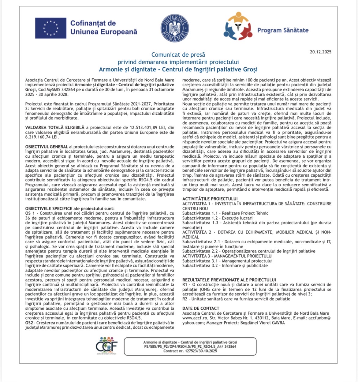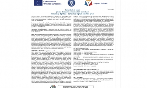 Comunicat de presă privind demararea implementării proiectului Armonie și dignitate - Centrul de îngrijiri paliative Groși