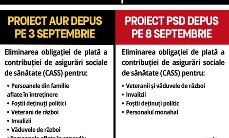Pe 3 septembrie 2025, Alianța pentru Unirea Românilor a înregistrat în Parlament un proiect prin care propune eliminarea obligației de plată a contribuției de asigurări sociale de sănătate (CASS) pentru categoriile cele mai vulnerabile: persoanele aflate în întreținere, foștii deținuți politici, veteranii și văduvele de război, invalizii, persoanele aflate în concediu pentru creșterea copilului și personalul monahal.