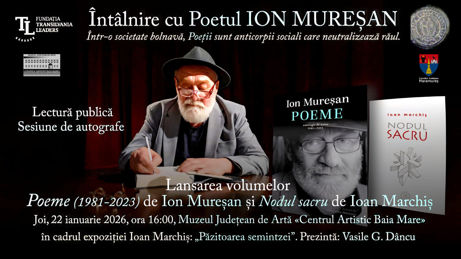Poetul Ion Mureșan a avut, în 22 ianuarie 2026, o întâlnire cu publicul băimărean, în cadrul expoziției „Păzitoarea semintzei” a sculptorului Ioan Marchiș. La Muzeul Județean de Artă „Centrul Artistic Baia Mare” a fost lansat volumul „Poeme” (1981-2023) al scriitorului Ion Mureșan, dar și volumul „Nodul sacru” al sculptorului Ioan Marchiș. A fost o întâlnire memorabilă, cu lectură publică și sesiune de autografe. Poetul Ion Mureșan este unul dintre cei mai apreciați scriitori contemporani din Nordul României, tocmai de aceea, publicăm recenzia scrisă de Ioan Marchiș, pentru a-i provoca pe cei interesați să aprofundeze opera poetului.