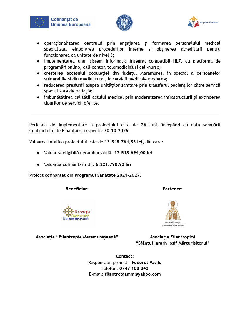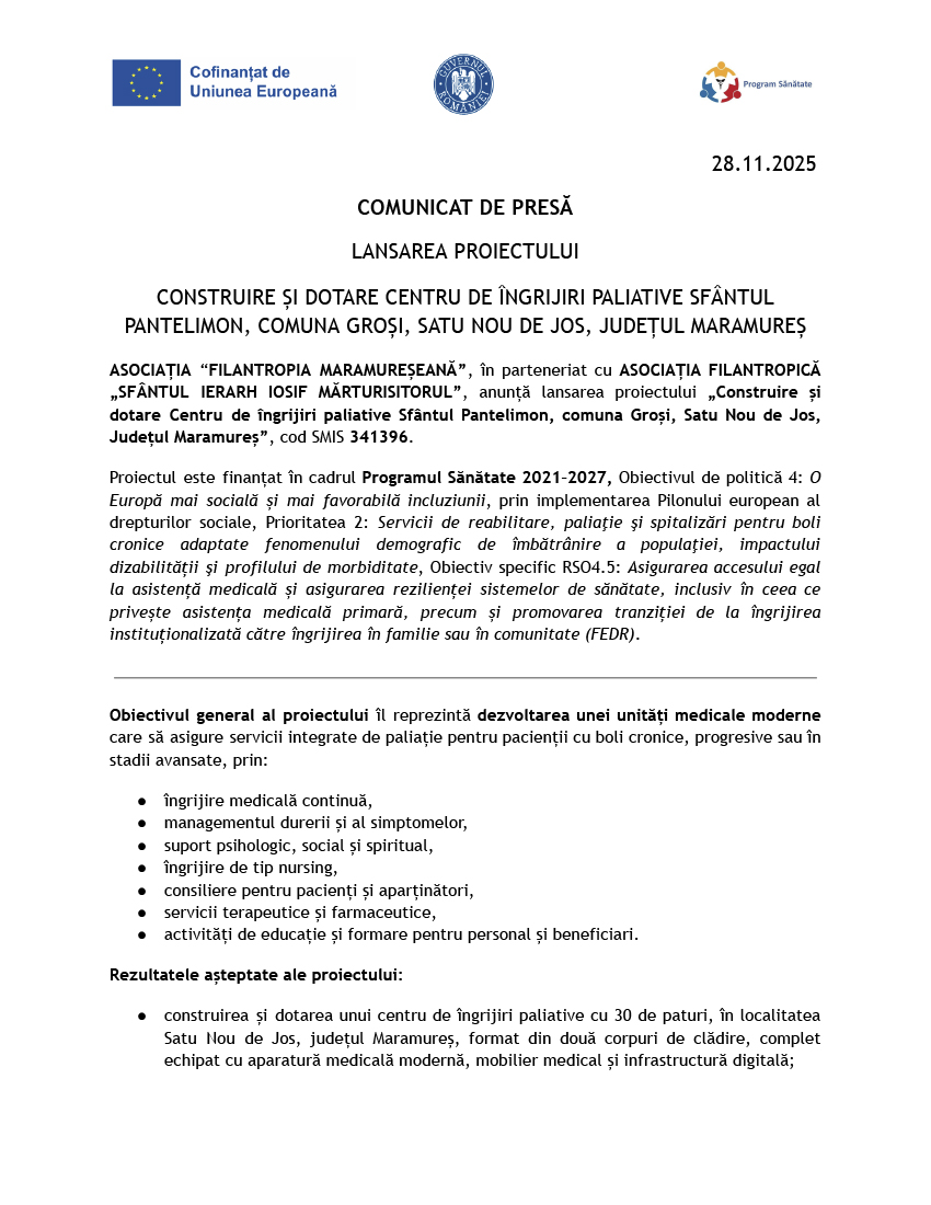 LANSAREA PROIECTULUI CONSTRUIRE ȘI DOTARE CENTRU DE ÎNGRIJIRI PALIATIVE SFÂNTUL PANTELIMON, COMUNA GROȘI, SATU NOU DE JOS, JUDEȚUL MARAMUREȘ