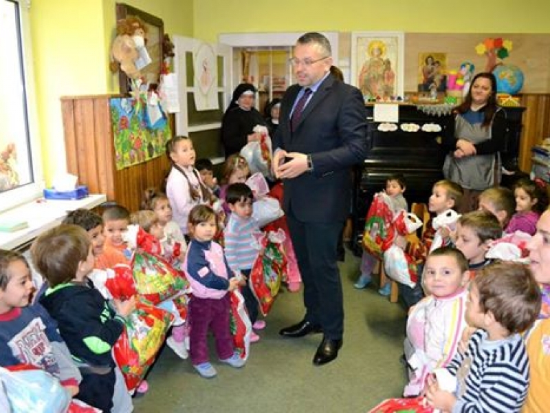 Moşul, ajutat de primarul Ovidiu Nemeş să le împartă cadouri copiilor