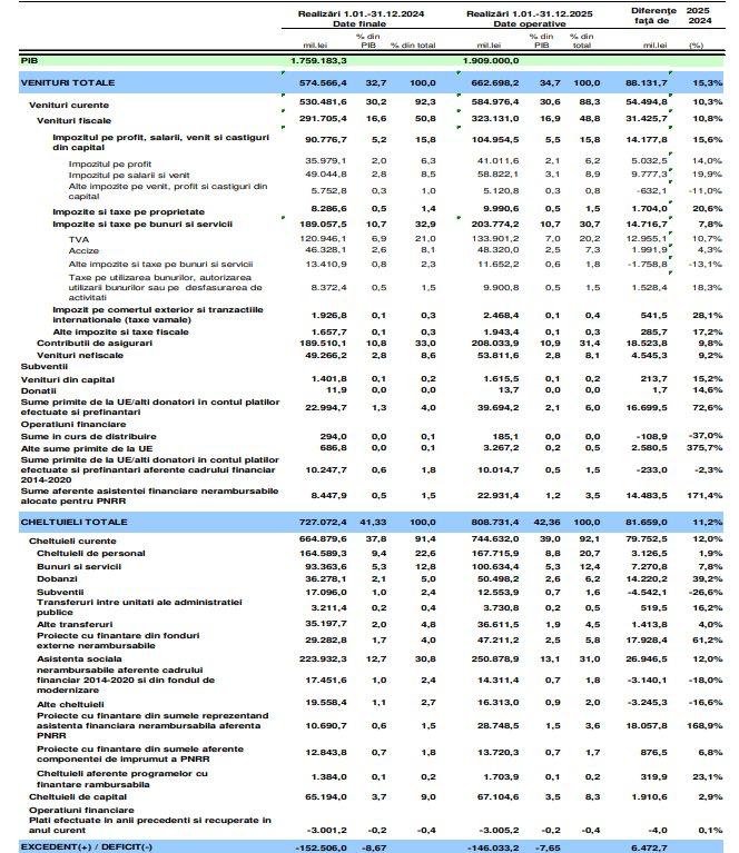 Deficitul bugetar „pe numerar” în 2025 ar fi fost fix același cu cel din 2024, dacă pe 2024 nu ar fi fost încasări suplimentare de peste 6 miliarde de lei din amnistia fiscală promovată de guvernul Ciolacu înainte de alegeri.
