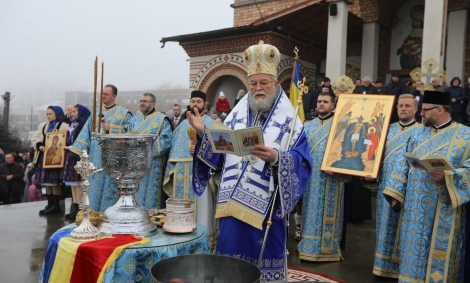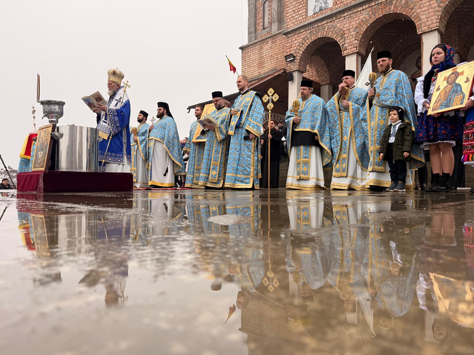După Sfânta Evanghelie, Preasfințitul Părinte Episcop Iustin a ieșit împreună cu soborul pe esplanada Catedralei Episcopale „Sfânta Treime”, unde, în prezența a peste 10.000 de credincioși de toate vârstele, a oficiat solemn Sfințirea Mare a apei sau Agheasma Mare.