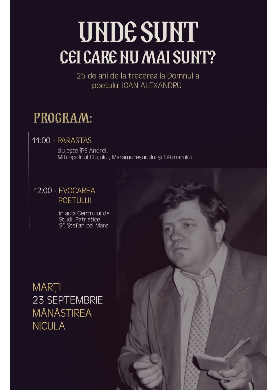 Suntem invitați toți cei care l-am cunoscut, direct sau indirect, l-am apreciat sau care încă nu l-am descoperit cu adevărat marți, pe 23 SEPTEMBRIE, de la ora 11.00, la Mănăstirea Nicula, la reîntâlnirea cu marele poet. În mijlocul nostru se va afla și Înaltpreasfințitul Andrei, mitropolitul Clujului, Maramureșului și Sătmarului care va sluji, împreună cu un sobor de preoți, slujba parastasului. Apoi, în Aula Centrului de Studii Patristice a mănăstirii, va avea loc evocarea poetului.